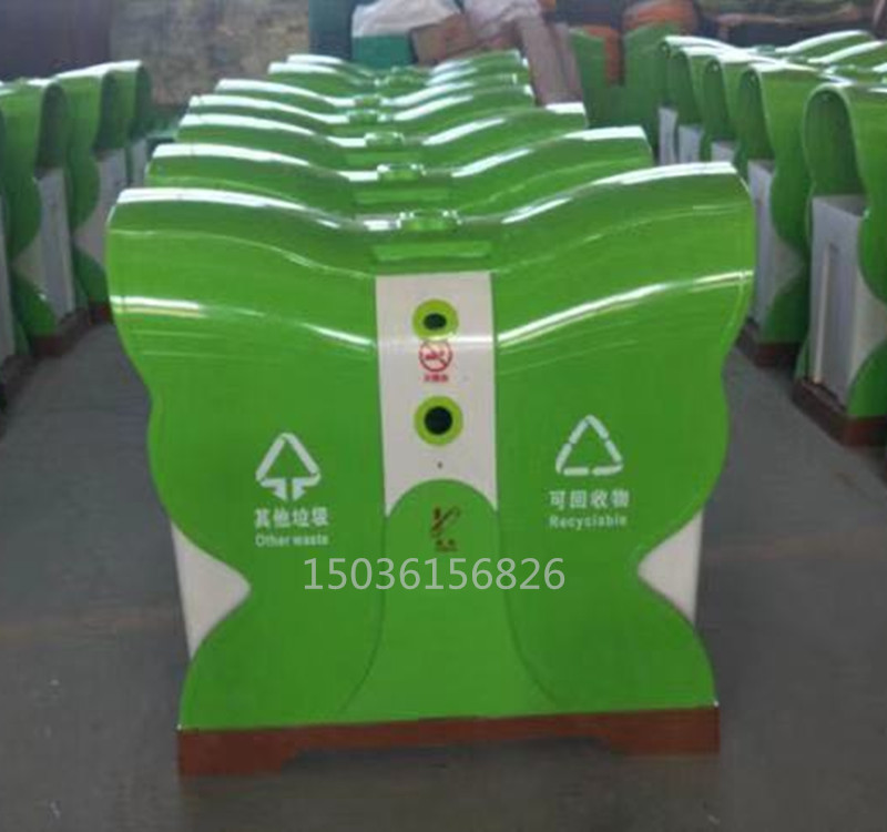 蝴蝶型分類環保垃圾桶果皮箱采用SMC復合材料,3500噸壓機模壓成型,內外光潔度一致。蝴蝶果皮箱采用鏡面模具生產,表面光潔度高,防涂鴉防粘貼,防砸,耐燒,永不生銹,不易褪色,耐酸堿,易清洗,使用壽命長